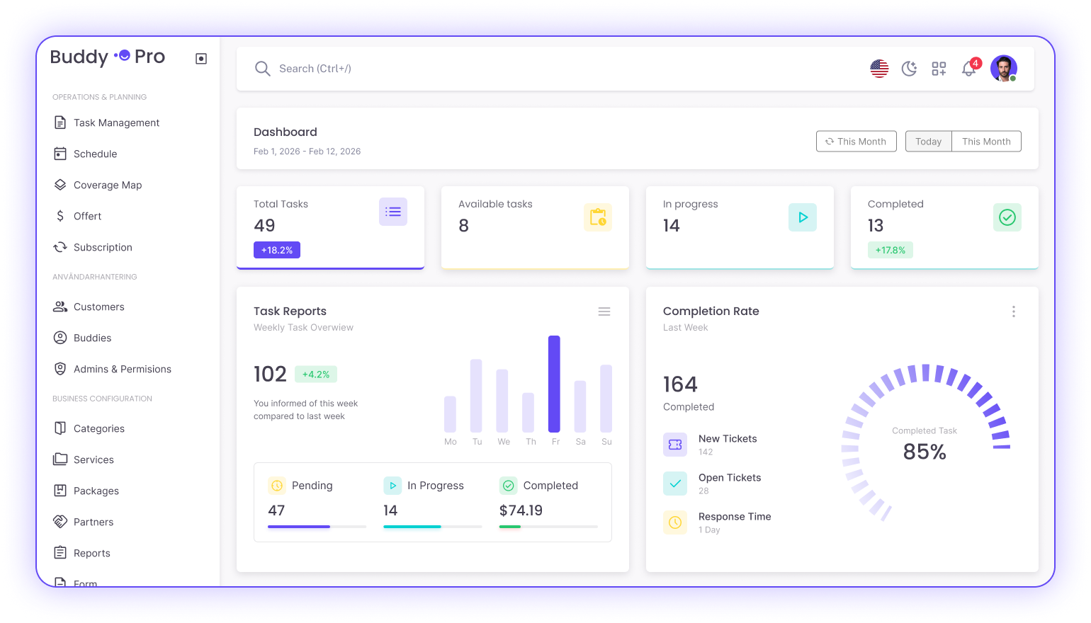 BuddyPro tar bort komplexiteten i regional och internationell service. Från snabb uppdragstilldelning och smart schemaläggning till lokal anpassning av tjänster och priser – vår täckningskarta gör det enkelt att expandera. Lägg tid på att utveckla affären, inte på administration.